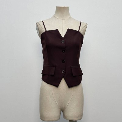 Deep V Neck Button Decor Short Camisole Vintage Burgundy Sleeveless Top