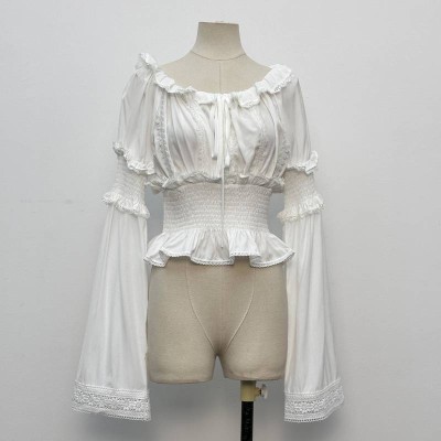 French Court Style Off-the-Shoulder Cropped Waist-Top White Lace Ruffle Flare Sleeve Top
