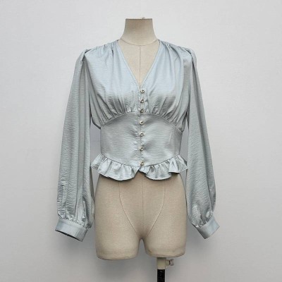 French V-neck Waist-cinched Ruffle Short Top Long-sleeve Elegant Blouse