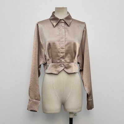 Satin Cropped Collar Shirt Elegant Long Sleeve Waist Top