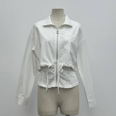 White Short Zip-up Lace Patchwork Lapel Long Sleeve Top