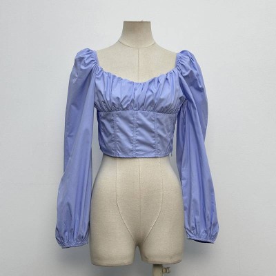 French Square Neck Off-Shoulder Cropped Top Puff Sleeve Waist-Cinching Blouse