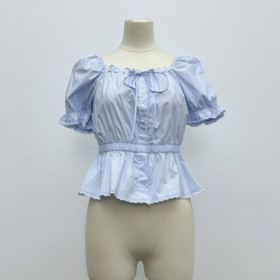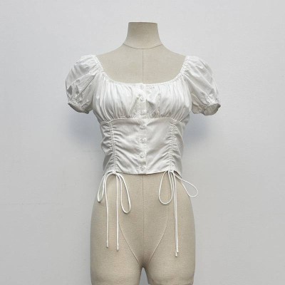 Square Neck Puff Sleeve Waist Cinched Short Shirt Sweet Lace Trim Lace-up Short Sleeve Top