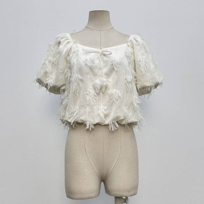 French Square Neck Tassel Decor Puff Sleeve Short Off-Shoulder Top
