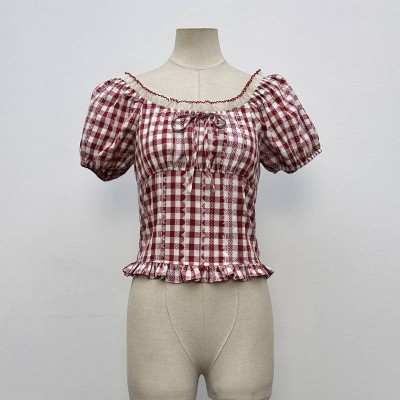 Vintage Red White Plaid Square Neck Puff Sleeve Cropped Top French Waist Ruffle Off-Shoulder Blouse