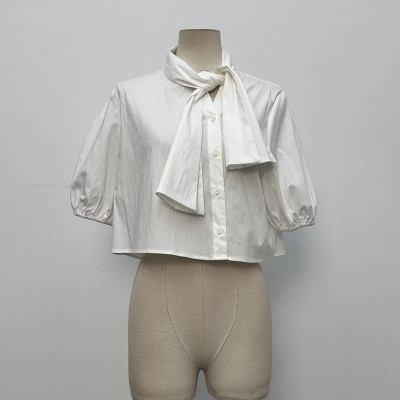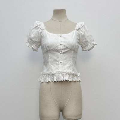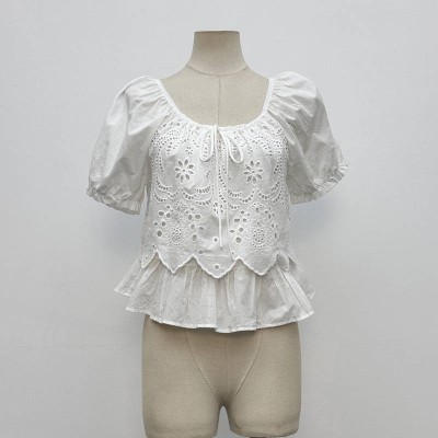 French White Puff Sleeve Hollow Embroidered Lace-up Short Top