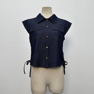Vintage Denim Style Collar Sleeveless Drawstring Cropped Top
