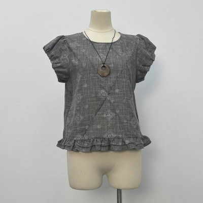 Vintage Plaid Jacquard Puff Sleeve Short Top Ruffled Hem Round Neck Women's Blouse