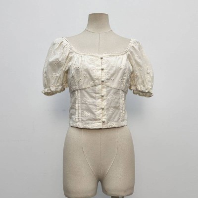 French White Embroidered Lace Puff Sleeve Top Loose Fit Short Doll Blouse