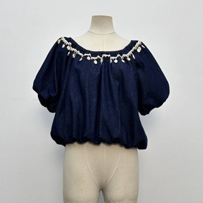 Vintage Denim Blue Off-the-Shoulder Puff Sleeve Cropped Top Shell Embellished Elastic Neck Pullover