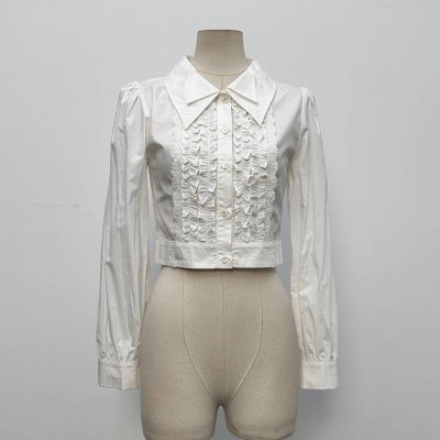 French Vintage Ruffle Decorated Short Lapel Shirt White Slim Long Sleeve Top