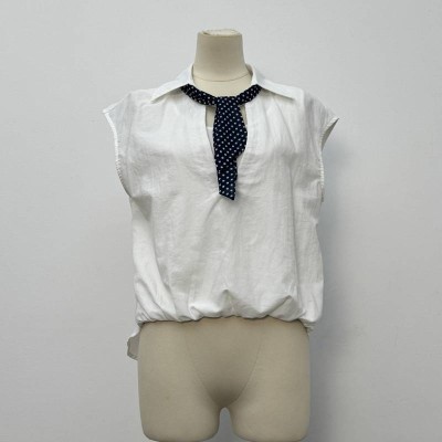 White Sleeveless Lapel Shirt with Polka Dot Decorative Collar Waist-cinched Cropped Top