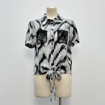 Tie-dye Print Lace Pocket Short-sleeved Shirt Hem Tie-up Lapel Cropped Top