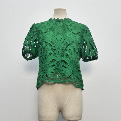 Vintage Green Lace Hollow-out Short Puff Sleeve Top