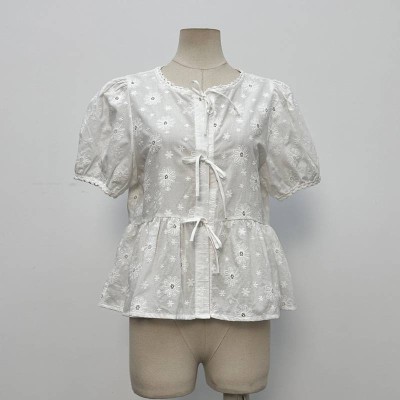 3D Floral Decor Puff Sleeve Short White Blouse