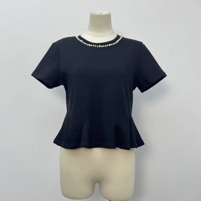 Black Short Waisted Short-sleeve Top with Pearl Neckline