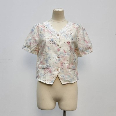 Lace V-neck Hollow Tie-dye Print Short-sleeved Cropped Top
