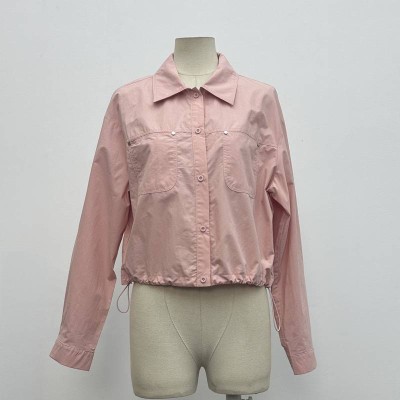 Pink Short Drawstring Lapel Long-sleeve Casual Shirt Top