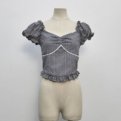 French Plaid Square Neck Puff Sleeve Cropped Top Lace Patchwork Waist Cinched Navel-Exposed Sweet Spicy Blouse