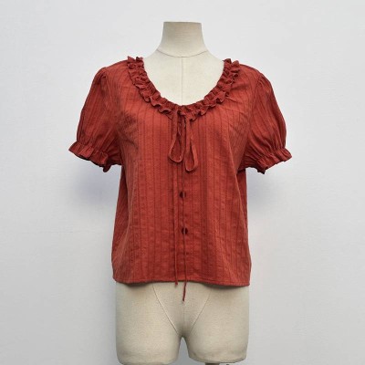 Vintage Reddish Brown Lace-up Ruffled Short-sleeve Cropped Top