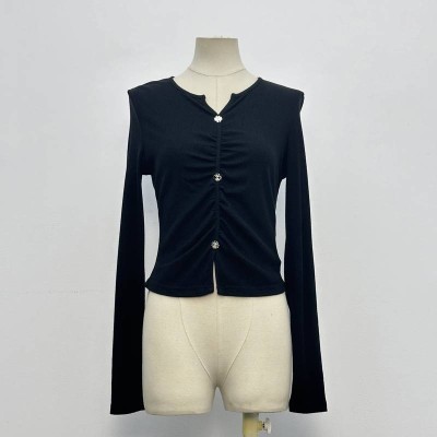 Black V-neck Ruched Diamond Button Short Long-sleeve Top Slim Fit Inner Wear Undershirt