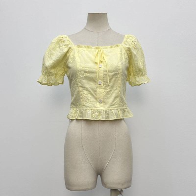 Yellow Square Neck Puff Sleeve Short Embroidered Tie-up Top