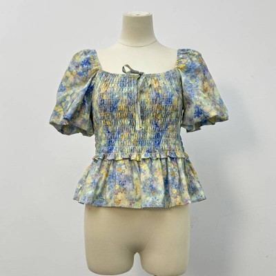 Square Neck Puff Sleeve Waist Cinched Floral Short Top