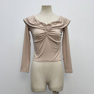 Elegant Nude Off-Shoulder Cropped Long-Sleeve Top Slim Fit Base Shirt