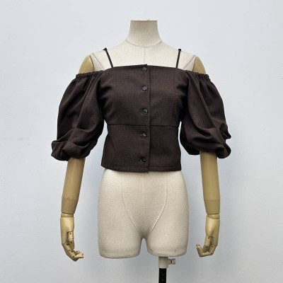 Vintage Coffee Off-Shoulder Camisole Cropped Top Puff Sleeve Button-up Waist-fitted Blouse