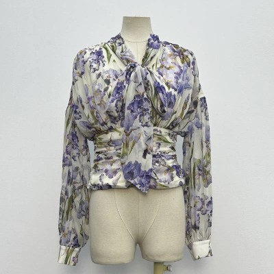 Iris Print Tie Neck Waist Cinched Chiffon Long Sleeve Cropped Blouse