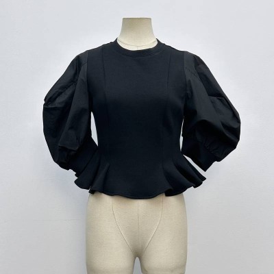 Black Waist-cinching Puff Sleeve Cropped Top Round Neck Ruffled Hem Slim Fit Top