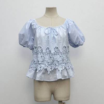 Light Blue Square Neck Puff Sleeve Lace Patchwork Short Top