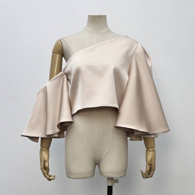 Elegant Satin Asymmetrical Off-Shoulder Cropped Top Ruffle Edge Niche Design Blouse