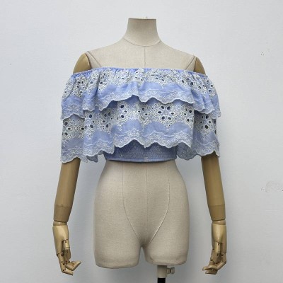 Blue Hollow Embroidered Off-Shoulder Cropped Top