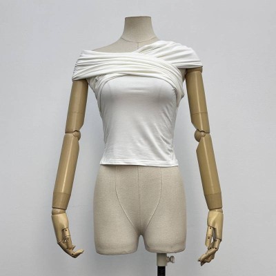 Elegant Satin Off-the-Shoulder Cropped Top Asymmetrical Ruffle Niche Design Slim Top