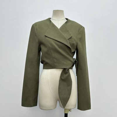 Vintage Army Green Cropped Tie-Waist Blazer Slim Fit V-neck Long Sleeve Top