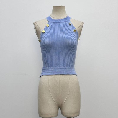 Chic Halter Neck Short Knit Sleeveless Top with Metal Buckle Decor