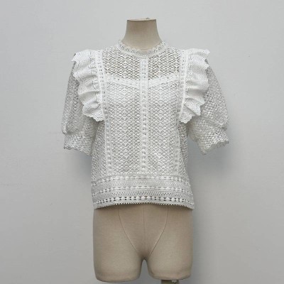 French Vintage Lace Hollow-out Short-sleeve Top Ruffled Stand Collar Cropped White Top
