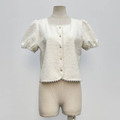 French Square Neck Puff Sleeve Cropped Top Lace Trim Jacquard Button Short Sleeve Top
