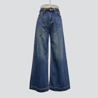 Vintage Washed Wide-Leg Jeans High Waist Slim-Fit Denim Trousers With Woven Belt