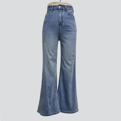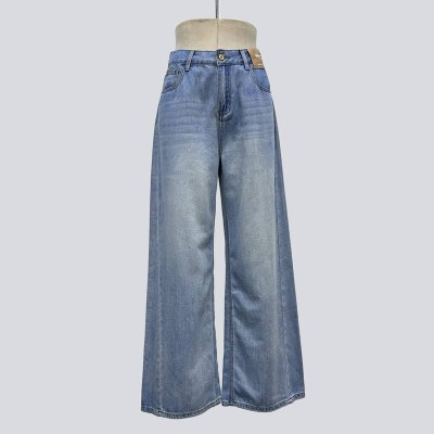 Vintage Washed Light Blue Denim Wide-leg Pants Drawstring High-waisted Casual Trousers