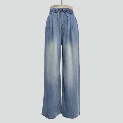 Vintage Gradient Drawstring High-waisted Denim Wide-leg Pants