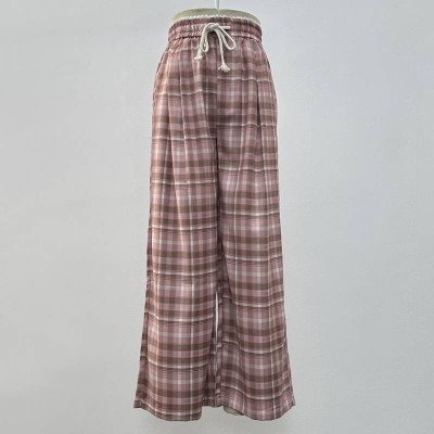 Pink Brown Plaid Drawstring High Waist Wide-leg Casual Pants