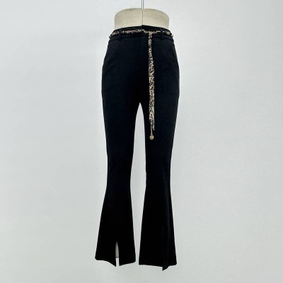 Black Split Flared Casual Pants with Leopard Print Waist Chain