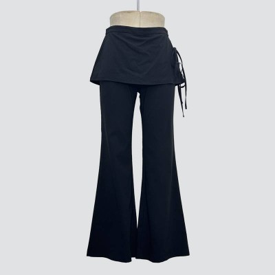 Black Tie-Waist Skirt Panel Fake Two-Piece Wide-Leg Pants High Waist Flared Casual Trousers