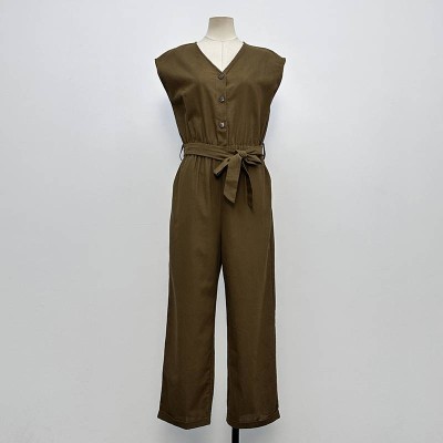 Khaki Sleeveless V-neck Waist-tie Wide-leg Jumpsuit Slim Fit One-piece Pants