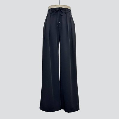 Simple Drawstring High Waist Black Wide Leg Pants, Draped Slimming Casual Trousers