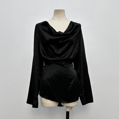 Black Velvet Draped Neck Waist-cinched Long Sleeve Top Elegant Slim Fit V-neck Commuter Bottoming Shirt