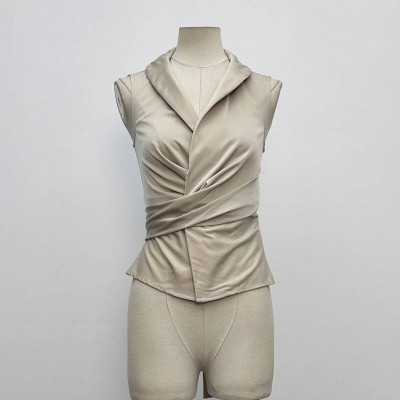 Satin Lapel Pleated Sleeveless Top Elegant Slim Fit Solid Color Commute Top
