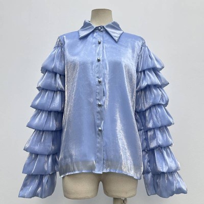 Shiny Glossy Multi-layer Ruffle Lapel Long Sleeve Shirt